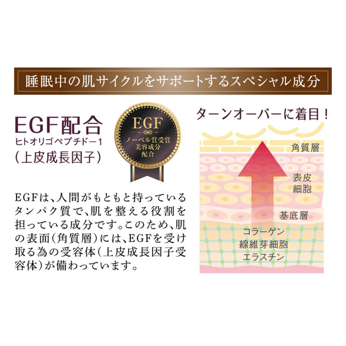 睡眠中のターンオーバーに着目したナイトエッセンスパックは、 お休み前に塗るだけの簡単液状パックです。 EGF(上皮成長因子)と厳選した美容成分がお肌をイキイキとさせ、 健やかに保ちます。