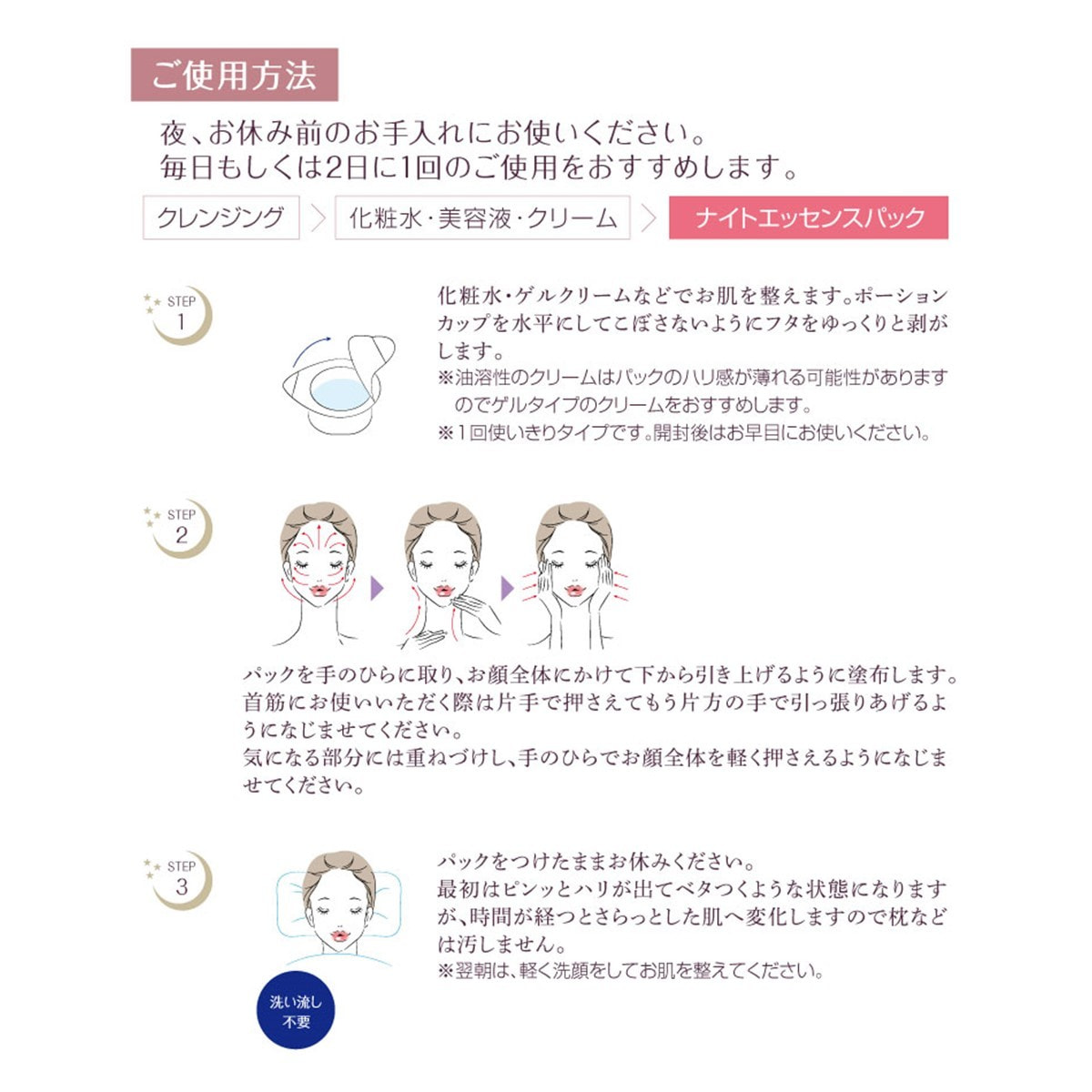 ※翌朝は、軽く洗顔をしてお肌を整えて下さい。
